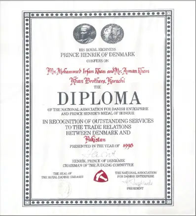 Recipient of Prince Henrik's Medal of Honor by his Royal Highness of Denmark to commemorate trade relations between Denmark & Pakistan